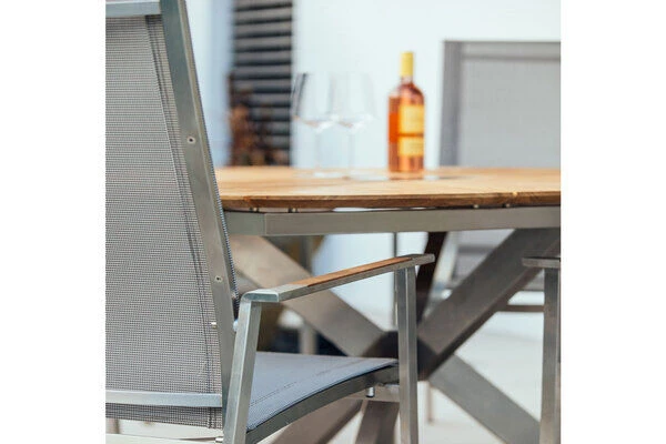 | Hochwertige Materialien Das Gestell des Tisches ist aus rostfreiem Edelstahl gefertigt und kann daher bei Wind und Wetter in Ihrem Garten stehen bleiben. Teakholz benötigt keine Pflege oder Behandlung und ist dank seines hohen Anteils natürlicher Öle besonders witterungsbeständig. | |