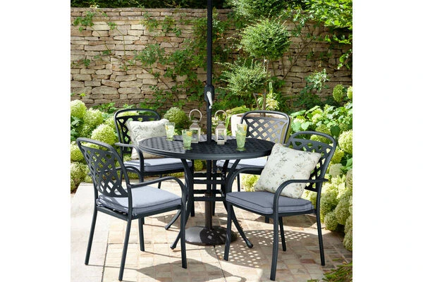 Elegant und zugleich robust präsentiert sich diese extravagante Esstischgruppe von Hartman für 4-6 Personen. Das Set besteht aus einem runden Esstisch mit den Maßen von ca. 105 x 105 x 74 cm und 4 Diningsesseln aus der „Preston“-Serie, welche in einem besonderen grau gehalten sind.