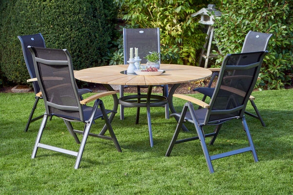 Modern und robust zugleich präsentiert sich diese besondere Esstischgarnitur aus dem Hause Hartman. Das Set besteht aus dem Gartentisch Provence und 5 Multipositionssesseln Alice.