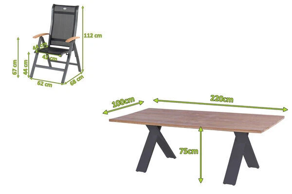 Der Tisch mit dem gekreuzten Gestell ist gefertigt aus pulverbeschichtetem Aluminium in der Farbe Xerix (Anthrazit) und wird optisch perfekt durch die Tischplatte aus SVLK-zertifiziertem Teakholz ergänzt. Die Maße von ca. 220 x 100 x 75 cm sorgen dafür, dass stets ausreichend Ablagefläche zur Verfügung steht und bequem 8 Personen genügend Platz finden.