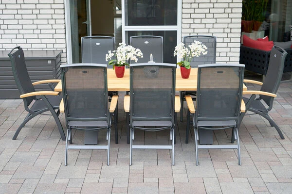 Modern und robust zugleich präsentiert sich diese besondere Esstischgarnitur aus dem Hause Hartman. Das Set besteht aus dem Gartentisch Xanadu und 8 Multipositionssesseln Da Vinci.
