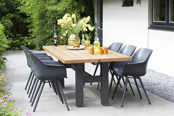 Hier treffen hochwertige Materialien und Design auf modernste Weise aufeinander. Der Tisch besteht aus einem hochwertigen Aluminiumgestell in der Farbe Xerix (Anthrazit) und einer ca. 4 cm dicken Teakholz-Tischplatte in der Farbe Vintage Brown. Mit seiner Größe von ca. 240 x 100 x 77 cm bietet er ausreichend Platz für 8 Personen.