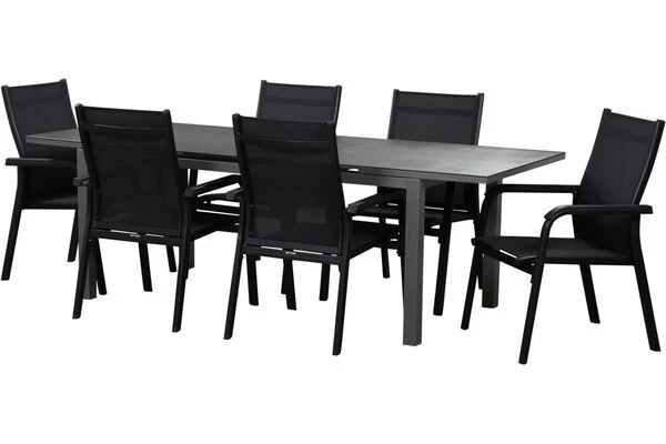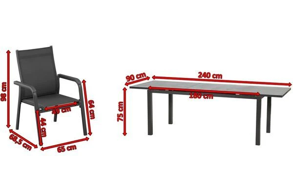 1x Ausziehtisch Siena Garden „Miros“, anthrazit/anthrazit, ca. 180/240 x 90 x 75 cm (508703) 6x Stapelsessel Kettler „Basic Plus“, anthrazit/anthrazit, ca. 69 x 66 x 98 cm (0301205-7000)