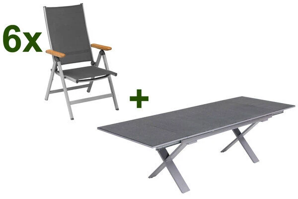 KETTLER Granada Esstischgarnitur aus Aluminium/Textilene, Silber, OUTFLEXX Ausziehtisch 180/280x100x78cm und 6 Multipositionssessel mit Armlehnen aus FSC®-Teakholz