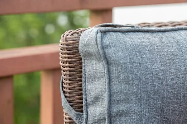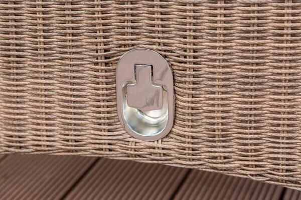 Das Untergestell des Möbelstücks besteht aus pulverbeschichtetem Aluminium, dies macht es nicht nur stabil, sondern sorgt auch dafür, dass es sich aufgrund des relativ geringen Gewichts von ca. 11,5 kg je Sessel ganz leicht hin und her stellen lässt. Das Aluminiumgestell wird mit Polyrattangeflecht bespannt. Das runde Geflecht ist in der Farbe hellbraun (Faser w18, Nature Exclusive Line) gehalten und der natürlichen Rattan-Faser nachempfunden – dies sorgt für einen sehr natürlichen und mediterranen Look. So passt diese Line wunderbar zu allen möglichen Terrasseneinrichtungen. Das gemütliche Sitz- und Rückenpolster (100 % Olefin (200 g/m³)) mit einer Stärke von ca. 5 cm sorgt für höchsten Sitzkomfort. Farblich ist das grau melierte Polster perfekt auf das Geflecht abgestimmt. Die synthetische Faser Olefin wird für ihre Hitzebeständigkeit und optimalen Trage- und Pflegeeigenschaften geschätzt. Sollten Sie einmal Falten in Ihren Polstern haben, werden diese bei Wärme von alleine verschwinden, sodass die Bezüge komplett bügelfrei sind. Textilien aus Olefin sind bequem, hautkühlend, waschbar und bügelfrei. Sie eignen sich perfekt für den Einsatz im Freien, was nicht zuletzt an ihrer wasserabweisenden und atmungsaktiven Materialzusammensetzung liegt.