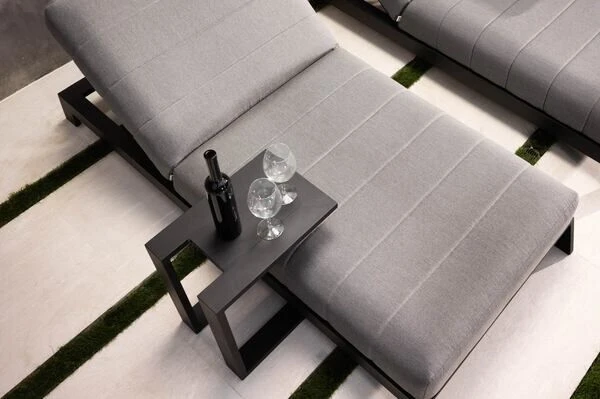 Dieser praktische und stylische Beistelltisch von OUTFLEXX® bietet dank seiner Maße von ca. 48 x 32 x 53 cm genügend Platz für kleine Snacks oder Getränke – so steht einem gemütlichen Mittag mit der Familie nichts im Wege, Sofafeeling inklusive. Besonders praktisch: Dank seiner speziellen Form kann der Tisch auch ganz leicht auf ein Sofa oder eine Liege draufgeschoben werden, so erhält man eine integrierte Ablagefläche. Das Möbelstück besteht aus Aluminium, dies macht es nicht nur stabil, sondern sorgt auch dafür, dass es sich aufgrund des geringen Gewichts von ca. 3,8 kg ganz leicht hin und her stellen lässt. Das Aluminiumgestell wurde mit einer schwarzen Pulverbeschichtung versehen, so ist es besonders wetterfest und passt außerdem wunderbar zu allen möglichen Terrasseneinrichtungen.