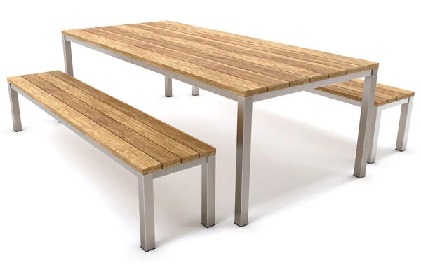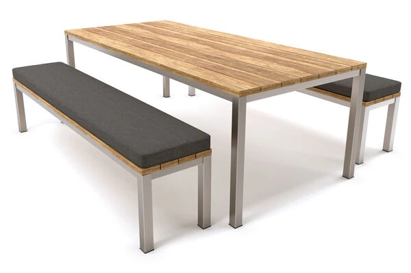 OUTFLEXX® Esstischgarnitur aus Edelstahl und recyceltem Teakholz