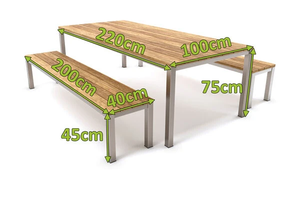 Das Set besteht aus einem Tisch mit den Maßen von ca. 220 x 100 x 75 cm und zwei Bänken mit den Maßen von ca. 200 x 40 x 45 cm. Die Tischplatte sowie die Sitzflächen der Bänke sind aus recyceltem Teakholz gefertigt. Für die Gestelle der Esstischgarnitur wurde Edelstahl verwendet. Die Farbkombination aus Silber und naturbelassenem Holz sorgt dafür, dass die Esstischgarnitur zu einem echten Hingucker im zeitlosen Design wird. Die hochwertige Materialkombination aus recyceltem Teakholz und Edelstahl gibt der Esstischgarnitur eine besondere Optik.