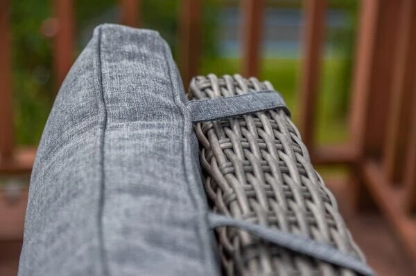 Das Untergestell der Möbel besteht aus Aluminium, dies macht sie nicht nur stabil, sondern sorgt auch dafür, dass sie sich aufgrund des relativ geringen Gewichts (Sessel ca. 21,8 kg, Hocker ca. 5,4 kg) ganz leicht hin und her stellen lässt. Das Aluminiumgestell wird mit Polyrattangeflecht bespannt. Das halbrunde Geflecht ist in der Farbe grau (Faser w5) gehalten und passt so wunderbar zu allen möglichen Terrasseneinrichtungen. Gemütliche Sitz- und Rückenpolster (100 % Polypropylen Olefin® (200 g/m³)) mit einer Stärke von ca. 7 cm (Hockerkissen ca. 4 cm) sorgen für höchsten Sitzkomfort. Farblich sind die grau melierten Polster perfekt auf das Geflecht abgestimmt. Die synthetische Faser Olefin wird für ihre Hitzebeständigkeit und optimalen Trage- und Pflegeeigenschaften geschätzt. Sollten Sie einmal Falten in Ihren Polstern haben, werden diese bei Wärme von alleine verschwinden, sodass die Bezüge komplett bügelfrei sind. Textilien aus Olefin sind bequem, hautkühlend, waschbar und bügelfrei. Sie eignen sich perfekt für den Einsatz im Freien, was nicht zuletzt an ihrer wasserabweisenden und atmungsaktiven Materialzusammensetzung liegt.