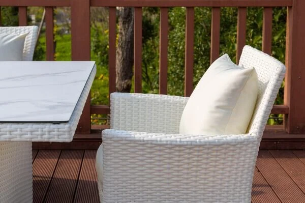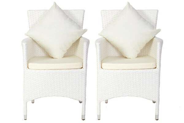 Das Untergestell der Möbel besteht aus Aluminium, dies macht sie nicht nur stabil, sondern sorgt auch dafür, dass sie sich aufgrund des relativ geringen Gewichts (je Sessel ca. 6,8 kg, Tisch ca. 42,8 kg) ganz leicht hin und her stellen lässt. Das Aluminiumgestell wird mit Polyrattangeflecht bespannt. Das flache Geflecht ist in der Farbe weiß (Faser w29) gehalten und passt so wunderbar zu allen möglichen Terrasseneinrichtungen. Gemütliche Sitz- und Rückenpolster (100 % Polyester) mit einer Stärke von ca. 5 cm sorgen für höchsten Sitzkomfort. Farblich sind die creme-weißen Polster perfekt auf das Geflecht abgestimmt. Die synthetische Faser Polyester wird für ihre Hitzebeständigkeit und optimalen Trage- und Pflegeeigenschaften geschätzt. Sollten Sie einmal Falten in Ihren Polstern haben, werden diese bei Wärme von alleine verschwinden, sodass die Bezüge komplett bügelfrei sind. Die Poster sind bequem, hautkühlend, waschbar und bügelfrei. Sie eignen sich perfekt für den Einsatz im Freien, was nicht zuletzt an ihrer wasserabweisenden und atmungsaktiven Materialzusammensetzung liegt.