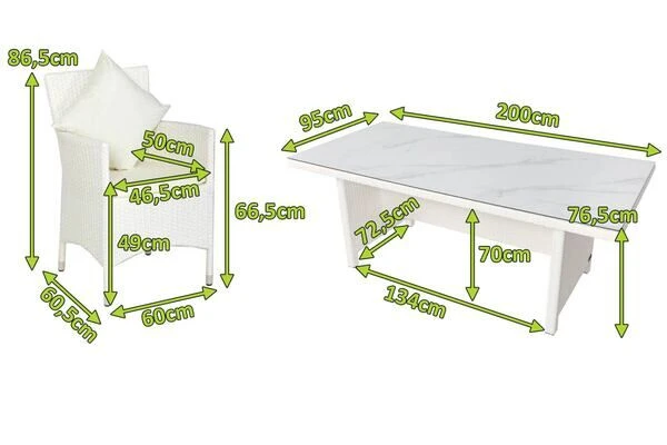 Dieses gemütliche Gartenmöbel Set bietet bequem bis zu sechs Personen Platz. Das Set besteht aus sechs Dining Sesseln und einem Dining Tisch. Hier können Sie bequem Ihr Mittag- oder Abendessen zu sich nehmen. Der Sessel hat ein Gesamtmaß von ca. 60,5 x 60 x 86,5 cm. Die Sitzfläche ist ca. 50 cm tief, die Sitzhöhe mit Kissen liegt bei ca. 49 cm. Die Armlehnen mit einer Höhe von ca. 66,5 cm sorgen bei diesem Sessel für besonderen Komfort. Die Sessel werden je in 2er Sets angeliefert. Die maximale Belastbarkeit pro Sessel liegt bei ca. 150 kg. Der praktische Diningtisch bietet dank seiner Maße von ca. 200 x 95 x 76,5 cm großzügig Platz für sechs bis acht Personen – so steht einem gemütlichen Mittagessen mit der Familie nichts im Wege. Er wird mit einer ca. 6 mm starken Spraystone Platte geliefert. Spraystone ist ein Kunststoff-Stein-Gemisch, das bei diesem Artikel auf Sicherheitsglas aufgesprüht und anschließend eingebrannt wird. Daraus ergibt sich eine wetter- und kratzfeste sowie pflegeleichte Oberfläche in einer eleganten Natursteinoptik, die sich mit einem milden Reiniger und einem Lappen kinderleicht pflegen lässt.