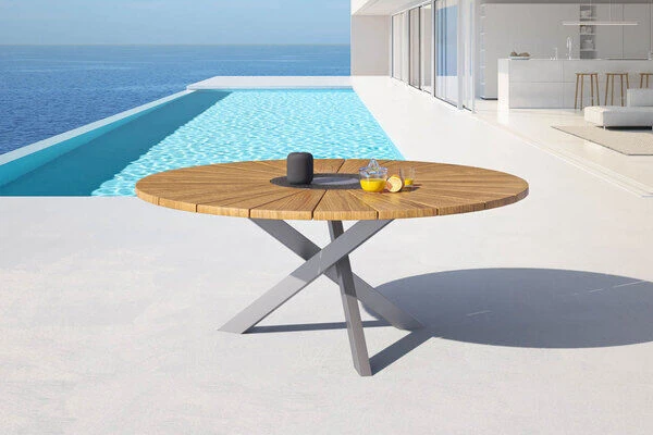 OUTFLEXX® Gartentisch aus FSC®-Teakholz und Edelstahl, ca. Ø 170 x 76 cm inkl. drehbarem Granitring und Eiskühler