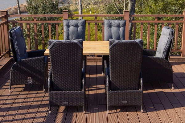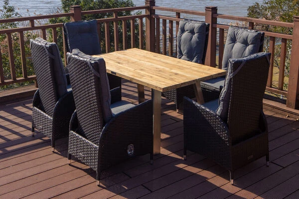 Der Esstisch überzeugt durch seine stattliche Größe von ca. 160 x 90 x 76 cm und bietet damit ausreichend Platz für 4-6 Personen. Das verwendete recycelte Teakholz der Tischplatte verleiht dem Tisch einen ganz besonderen Charme. Die rustikal gebürstete Oberfläche sorgt dafür, dass die natürliche Struktur des Holzes erhalten bleibt und die Maserung besonders gut zum Vorschein kommt. Das Zusammenspiel aus dieser massiven Oberfläche und dem edlen 304er Edelstahl, verleiht dem Tisch sein besonderes Aussehen und sorgt dafür, dass er perfekt zu den Polyrattan-Sesseln passt. Die Stärke der Tischplatte von ca. 4 cm und das besonders geformte Tischgestell unterstreichen das Zusammenspiel aus rustikalen und edlen Elementen zusätzlich.