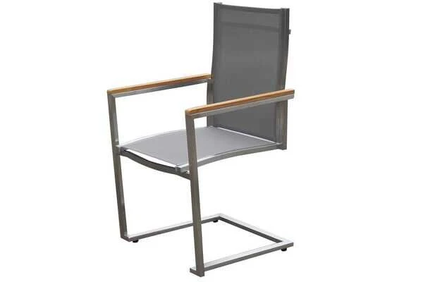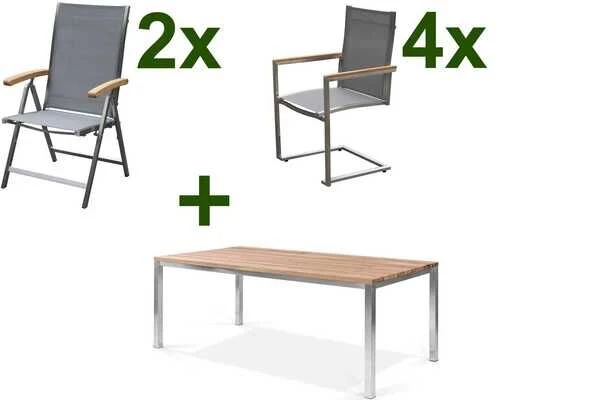1x OUTFLEXX® Gartentisch, recyceltes Teakholz, ca. 200 x 100 x 76 cm 4x OUTFLEXX® Freischwinger silber, Edelstahl/Textilene, ca. 58,5 x 53 x 89 cm 2x OUTFLEXX® Multipositionssessel silber, Edelstahl/Textilene, ca. 68 x 61 x 103 cm