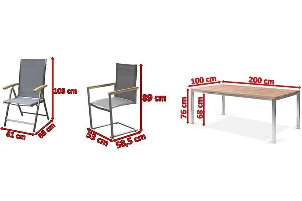Wenn Sie sich jetzt angesprochen fühlen, sollten Sie sich diese Esstischgarnitur noch genauer anschauen. Das Set besteht aus einem Esstisch mit den Maßen von ca. 200 x 100 x 76 cm, 4 Stapel- und 2 Multipositionssesseln aus einer Teak/Edelstahl Kombination mit einer Textilenbespannung in der Farbe Silber.