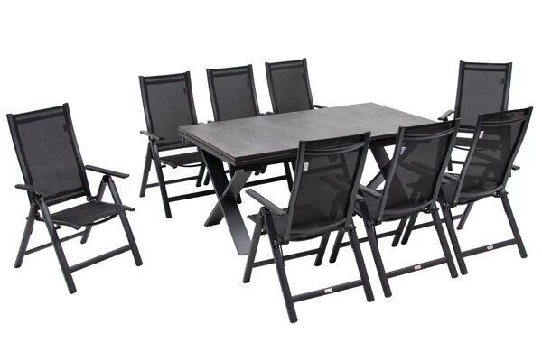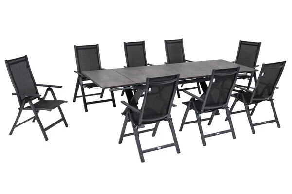 9-teilige Esstischgarnitur von OUTFLEXX® mit Ausziehtisch 180/280x100cm und 8 Multipositionssesseln aus Aluminium/HPL/Textilene in schwarz
