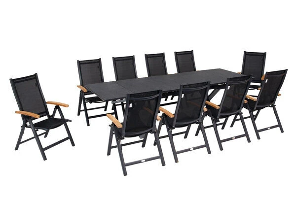 11-teilige Esstischgarnitur von OUTFLEXX® aus Aluminium/Textilene, inkl. 10 Multipositionssessel mit Armlehnen aus recyceltem FSC®-Teakholz