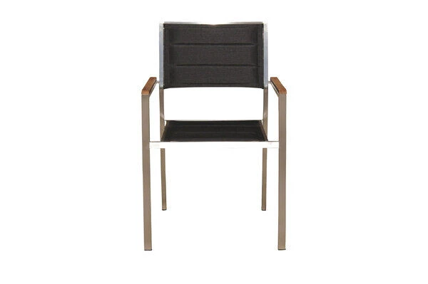 Dieser zeitlose Stuhl besitzt eine Bespannung aus hochwertigem Textilen hergestellt aus 75% Polyvinylchlorid und 25% Polyester. Das witterungsbeständige Material ist durch seine Flexibilität und seine zusätzliche Polsterung (padded) auch ohne Auflagen sehr bequem. Das formstabile Gewebe nimmt kein Wasser auf, ist atmungsaktiv und trocknet nach einem kurzen Schauer sehr schnell. Das sorgfältig verarbeitete Gestell aus rostfreiem 304er Edelstahl ist ebenfalls besonders witterungsbeständig und hält wie die anderen Materialien dieses Stuhls sowohl Frost und Hitze als auch Feuchtigkeit und Regen aus. Das für die Armlehnen verwendete Teakholz ist FSC-zertifiziert und stammt damit aus verantwortungsvollen Quellen. So können Sie sich guten Gewissens zurücklehnen und sich so richtig entspannen. Die hochwertigen Materialien und die sorgfältige Verarbeitung sorgen nicht nur für die besondere Optik dieses Stuhls, sondern machen ihn mit einer Belastbarkeit von ca. 150 kg sehr stabil. Dank der schwarzen Kunststoffkappen an den Stuhlbeinen ist Ihr Boden geschützt. Nachdem die Gäste sich auf den Weg gemacht haben, können Sie die Stühle einfach stapeln und damit platzsparend verstauen.