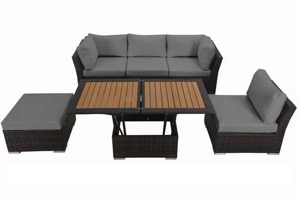 Variable Sitzgruppe mit Kissenboxfunktion aus Polyrattan in braun-marmoriert inkl. höhenverstellbarem Loungetisch, Ersatzbezugset in grau und Abdeckhaube