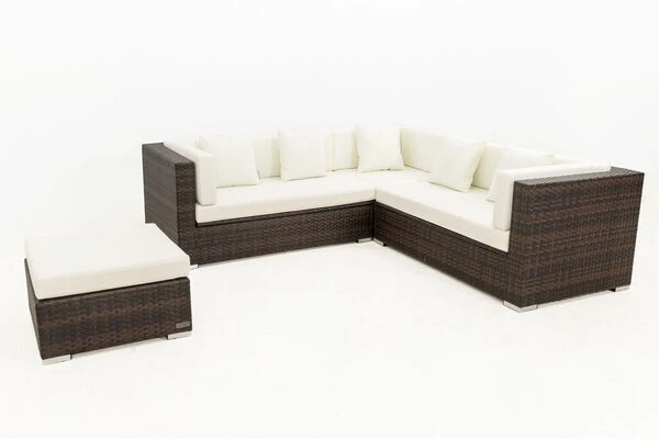 Diese gemütliche Loungegruppe besteht aus 4 Modulen, die Sie beliebig anordnen können. Sie bestimmen somit selbst, wie sich die Möbel auf Ihrer Terrasse am besten präsentieren. Ihre neuen Gartenmöbel sind äußerst pflegeleicht und strapazierfähig, da die verwendete flache Faser sowohl Hitze und Frost als auch UV-Strahlen, Salzwasser und Chlor unbeschadet hinnimmt und nichts von ihrer ursprünglichen Schönheit einbüßt. Im Inneren befindet sich ein rostfreies Aluminiumgestell, welches für die nötige Stabilität sorgt und aufgrund des geringen Gewichts einen einfachen Platzwechsel ermöglicht. Der 1-Sitzer ist mit bis zu ca. 150 kg belastbar, beim 2-Sitzer Sofa sind es sogar ca. 300 kg. Alle Module verfügen über edle Aluminiumfüße, die dank der Kunststoffnoppen Ihren Bodenbelag schonen und einen schönen Kontrast zur Polyrattanfaser bilden.