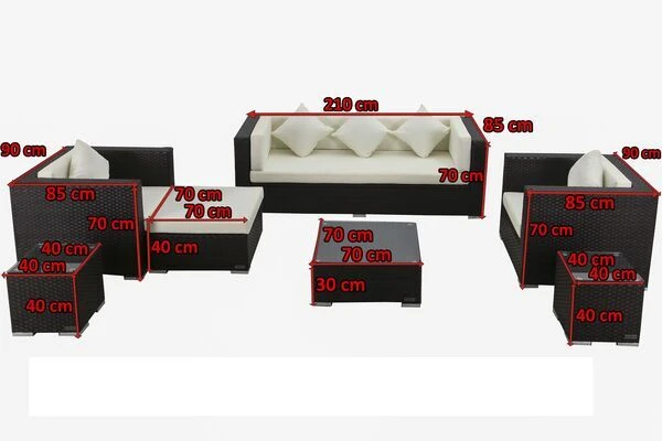 Die Sitzgruppe umfasst ein großes 3-Sitzer-Sofa, zwei Sessel, zwei kleine Beistelltische sowie zwei Hocker, die Sie dank der mitgelieferten Glasplatten auch als Kaffeetisch nutzen können. Damit ist Ihre Terrasse direkt vollständig ausgestattet. Die hochwertige und wertbeständige Sitzgruppe bietet bis zu sechs Personen einen bequemen Sitzplatz. Hitze und Frost hält die strapazierfähige, flache Polyrattanfaser ebenso stand wie Salzwasser, Chlor und UV-Strahlen. Die Polster der Loungemöbel verfügen über hochwertige Bezüge aus 100% Polyester (300g/m²), die wasserabweisend beschichtet sind und sich angenehm auf der Haut anfühlen.