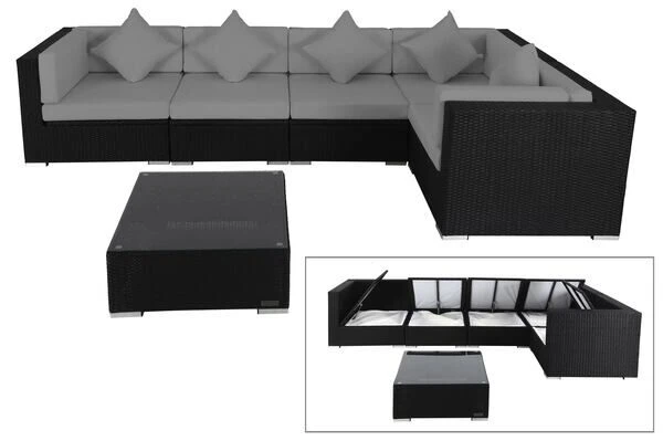 Polyrattan-Sitzgruppe mit Kissenboxfunktion inkl. Kaffeetisch in schwarz für 5 Personen