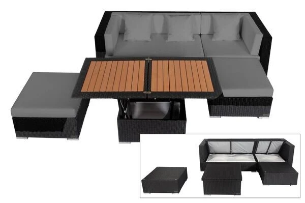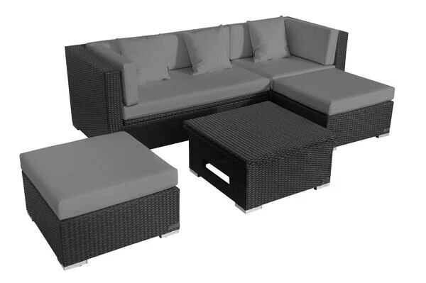 Laden Sie doch einmal wieder Freunde und Familie zu sich nach Hause ein und genießen Sie das Zusammensein. Mit dieser Sitzgruppe aus schwarzem, flachen Polyrattan haben Sie zukünftig Platz für bis zu 5 Personen und einem entspannten Familiensonntag oder dem spannend spaßigen Spieleabend mit Freunden steht nichts mehr im Wege.