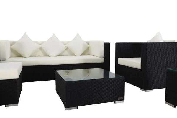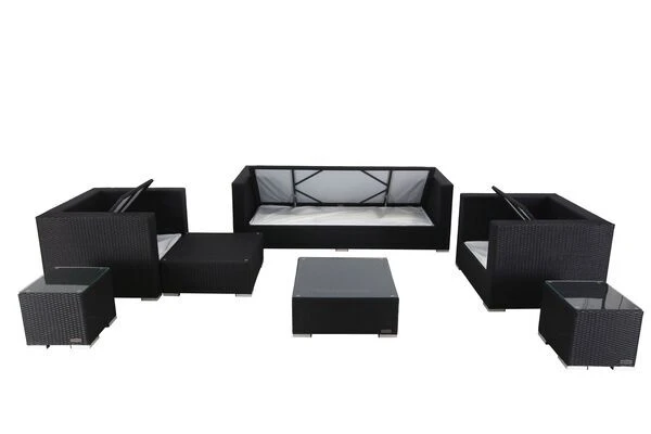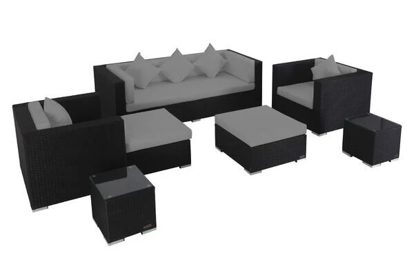Das Loungemöbel-Set besteht aus zwei Sesseln, einem 3-Sitzer-Sofa, zwei kleinen Beistelltischen sowie einem Hocker und einem Kaffeetisch mit je einem Sitzpolster und einer Sicherheitsglasplatte.