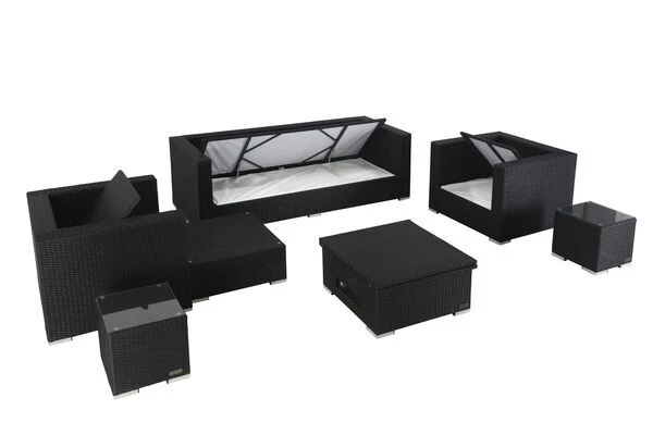 Edel und schön: OUTFLEXX® Polyrattan Loungegruppe inkl. höhenverstellbaren Loungetisch mit Kissenboxfunktion in Schwarz für 6 Personen