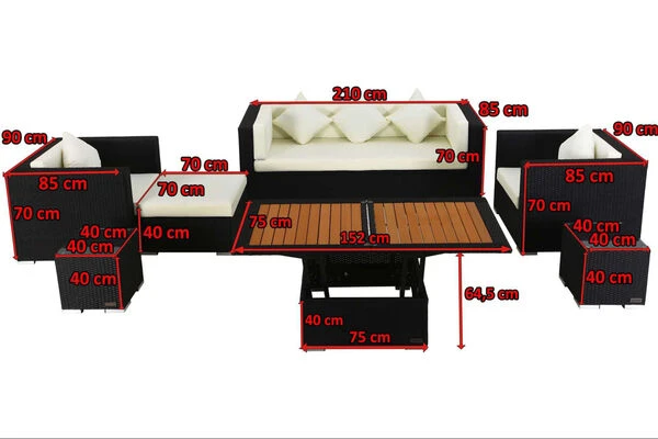 Das Loungemöbel-Set besteht aus zwei Sesseln, einem 3-Sitzer-Sofa, zwei kleinen Beistelltischen, einem höhenverstellbaren Loungetisch sowie einem Hocker mit einem Sitzpolster und einer Sicherheitsglasplatte. Was den höhenverstellbaren Loungetisch so besonders macht, ist seine Vielseitigkeit, denn er ist nicht nur als Loungetisch nutzbar, sondern lässt sich bei Bedarf mit einem einfachen Mechanismus in einen Esstisch verwandeln. Der Tisch passt sich somit ideal Ihren persönlichen Bedürfnissen an. Dieses Set bietet Ihnen also alles, was Sie für einen entspannten Sommer benötigen und wird garantiert der neue Blickfang in Ihrem Garten oder auf der Terrasse.
