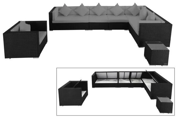 Die Loungegruppe besteht aus einem Sessel, einem 3-Sitzer Sofa, einem 2-Sitzer-Eckelement, zwei Mittelelementen, sowie einem eleganten Beistelltisch und lässt sich variabel anordnen. Der 1-Sitzer ist mit bis zu ca. 150 kg belastbar, beim 2-Sitzer Sofa sind es ca. 300 kg und beim 3-Sitzer sogar ca. 450 kg. Der 1-Sitzer ist mit bis zu ca. 150 kg belastbar, beim 2-Sitzer Sofa sind es ca. 300 kg und beim 3-Sitzer sogar ca. 450 kg. Die Sitzflächen der Möbel lassen sich hochklappen. Der Stauraum darunter ist jeweils mit einer wasserdichten Kissentasche ausgestattet, die mittels Reißverschluss geschlossen wird. Alle Polster lassen sich so sicher und problemlos verstauen.