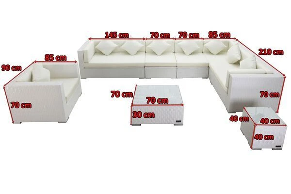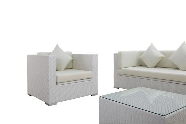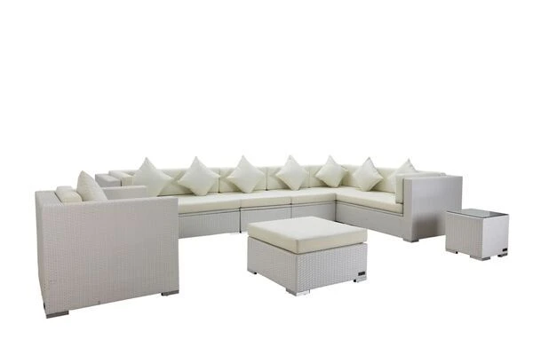 Mit seinem großzügigen Platzangebot ist diese OUTFLEXX® Loungegarnitur ein wahres Prachtexemplar und bietet besonders hohen Sitzkomfort dank seiner ca. 10 cm dicken Polstern, welche mit wasserabweisenden Bezügen aus 100% Polyester (300g/m²) geschützt sind. Die verwendete weiße flache Polyrattanfaser ist pflegeleicht und besonders wetterfest. Sie trotzt nicht nur extremen Temperaturen zwischen -60°C bis +70°C, sondern ist ebenso unempfindlich gegen Chlor, Salzwasser und UV-Strahlen. Im Inneren befindet sich ein rostfreies Aluminiumgestell, welches für die nötige Stabilität sorgt und aufgrund des geringen Gewichts einen einfachen Platzwechsel ermöglicht. So erweist sich diese wertbeständige Polyrattan Gartenlounge als langlebiger Begleiter.