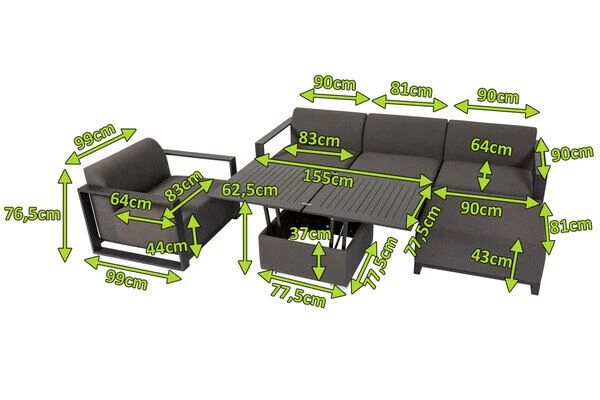 Die perfekten Möbel für Ihren neuen Lieblingsplatz. Das Lounge-Set besteht aus einem Sessel mit Armlehnen (ca. 99 x 90 x 76,5 cm), zwei Eckelementen mit jeweils einer Armlehne (ca. 90 x 90 x 76,5 cm), einem Mittelelement (ca. 81 x 90 x 76,5 cm), einem Hocker (ca. 81 x 90 x 43 cm) und einem höhenverstellbaren Loungetisch (ca. 77,5 x 77,5 x 37 cm). Hier können Sie gemeinsam mit Ihren Lieben Mittag- oder Abendessen, nachmittags bei Kaffee und Kuchen beisammensitzen oder auch einfach nur den Abend gemütlich ausklingen lassen. Die elegante Loungegruppe bietet bequem bis zu 5 Personen Platz. Jede Sitzfläche ist mit ca. 64 cm Tiefe und ca. 83 cm Breite großzügig proportioniert und kombiniert mit den luxuriösen Polstern erhalten Sie höchsten Sitzgenuss. Das Zusammenspiel aus robusten, pulverbeschichteten Aluminium-Gestellen in anthrazit mit Polstern aus Sunbrella-Schaumstoff in „sooty“ unterstreicht den modernen Charakter der Polstermöbel. Hier sitzen Sie nicht nur bequem, sondern mit Stil! Auf der großen Sitzfläche der Ecklounge lässt es sich auch herrlich bei einem Mittagsschläfchen entschleunigen. Und der Hocker bietet nicht nur eine tolle Sitzgelegenheit, er ist auch perfekt zum Hochlegen Ihrer Füße oder zum Vergrößern der Liegefläche. Einfach hinsetzen, Füße hoch und die Entspannung kommt fast von selbst.