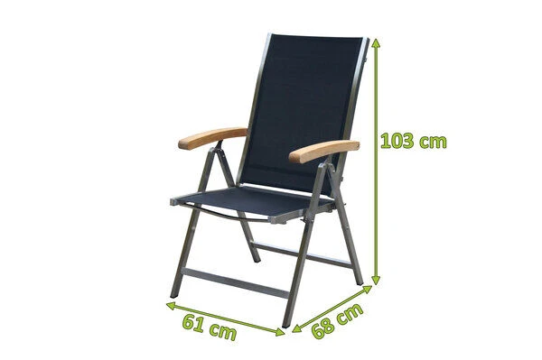 Dieser Multipositionssessel ist nicht nur ein Highlight in Sachen Optik, sondern weiß auch durch seinen Komfort und durch seine qualitative Verarbeitung zu überzeugen. Für ein komfortables Sitzen sorgt die hochwertige textilene Bespannung (75% Polyvinylchlorid und 25% Polyester), die den Multipositionssessel auch ohne Auflagen äußerst bequem macht. Außerdem ist er mittels Rasterschiene 4-fach verstellbar, sodass der Sessel je nach Bedarf in eine Sitz- oder Liegeposition gebracht werden kann. Das zeitlose Design aus einem rostfreien Edelstahlgestell mit einer Textilenbespannung in der Farbe schwarz, macht den Sessel zu einem optischen Highlight für jede Terrasse. Armlehnen aus Teakholz ergänzen das edle Design. Dank der verwendeten Materialien hat dieser Multipositionssessel das sehr geringe Eigengewicht von ca. 9 kg, wodurch er leicht zu handhaben ist und bei Bedarf schnell und einfach zusammengeklappt und platzsparend verstaut werden kann.