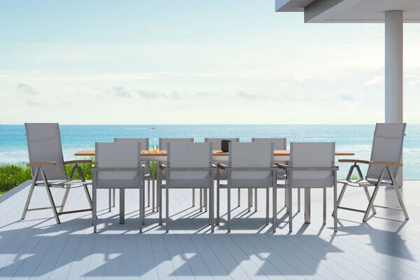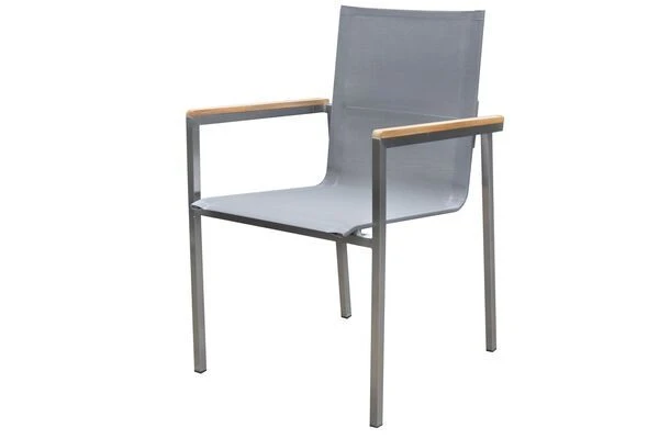 Für ein komfortables Sitzen sorgt die hochwertige textilene Bespannung, die die Sessel auch ohne Auflagen äußerst bequem macht. Außerdem sind die Multipositionssessel mittels Rasterschiene 4-fach verstellbar, sodass diese je nach Bedarf in eine Sitz- oder Liegeposition gebracht werden können. Das zeitlose Design aus einem rostfreien Edelstahlgestell mit einer Bespannung in der Farbe taupe, machen die Sessel zu einem optischen Highlight für jede Terrasse. Armlehnen aus Teakholz ergänzen das edle Design. Dank der verwendeten Materialien haben die Sessel ein sehr geringes Gewicht, was ein leichtes Umstellen oder Verschieben ermöglicht. Bei Bedarf können die Sessel schnell und einfach zusammengeklappt und platzsparend verstaut werden.