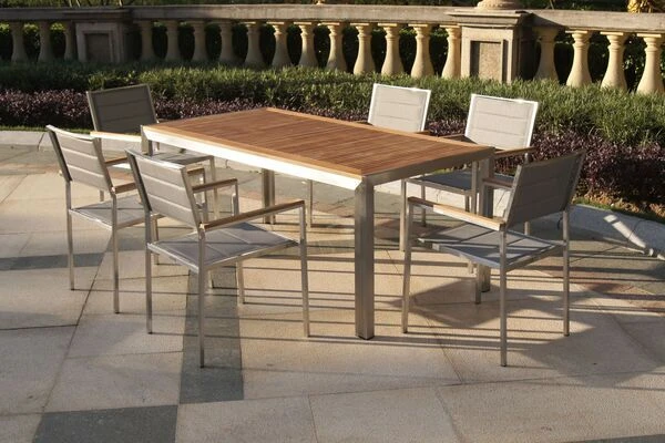 Dieser zeitlose Stuhl besitzt eine Bespannung aus hochwertigem Textilen hergestellt aus 70% Polyvinylchlorid und 30% Polyester. Das witterungsbeständige Material ist durch seine Flexibilität und seine zusätzliche Polsterung (padded)auch ohne Auflagen sehr bequem. Das formstabile Gewebe nimmt kein Wasser auf, ist atmungsaktiv und trocknet nach einem kurzen Schauer sehr schnell. Das sorgfältig verarbeitete Gestell aus rostfreiem 304er Edelstahl ist ebenfalls besonders witterungsbeständig und hält wie die anderen Materialien dieses Stuhls sowohl Frost und Hitze als auch Feuchtigkeit und Regen aus. Das für die Armlehnen verwendete Teakholz ist FSC-zertifiziert und stammt damit aus verantwortungsvollen Quellen. So können Sie sich guten Gewissens zurücklehnen und sich so richtig entspannen. Die hochwertigen Materialien und die sorgfältige Verarbeitung sorgen nicht nur für die besondere Optik dieses Stuhls, sondern machen ihn mit einer Belastbarkeit von ca. 150 kg sehr stabil. Dank der schwarzen Kunststoffkappen an den Stuhlbeinen ist Ihr Boden geschützt. Nachdem die Gäste sich auf den Weg gemacht haben, können Sie die Stühle einfach stapeln und damit platzsparend verstauen.