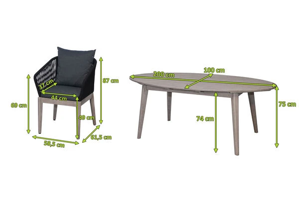Die Sessel haben ein Gesamtmaß von jeweils ca. 58,5 x 61,5 x 87 cm und bei einer Belastbarkeit von ca. 110 kg ist er sehr robust. Mit seinem geringen Gewicht von ca. 8,5 kg ist der Sessel zudem schnell und einfach umzustellen. Die Sitzfläche ist ca. 37 cm tief, die Sitzhöhe mit Kissen liegt bei ca. 49 cm. Der enthaltene Esstisch bietet mit Maßen von ca. 200 x 100 x 75 cm eine ausladende Abstellfläche – genügend Platz für Kaffee und Kuchen, oder aber auch für Snacks und Getränke. Dazu weist der Tisch mit ovaler Tischplatte eine Unterschubhöhe von ca. 74 cm vor. Die Diningsessel können mit einer Armlehnenhöhe von ca. 69 cm problemlos unter den Tisch geschoben werden.