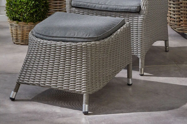 Das Untergestell besteht aus pulverbeschichtetem Aluminium, dies macht es nicht nur stabil, sondern sorgt auch dafür, dass sich der Hocker aufgrund des geringen Gewichts ganz leicht hin und her stellen lässt. Das Aluminiumgestell wird mit Polyrattangeflecht bespannt. Das halbrunde Geflecht ist in der Farbe stahlgrau-meliert gehalten und integriert sich so wunderbar in alle möglichen Terrasseneinrichtungen. Das gemütliche Sitzpolster (100 % Polyester (220 g/m³)) sorgt für das Plus an Komfort. Farblich ist das schiefergraufarbene Polster perfekt auf das Geflecht abgestimmt.