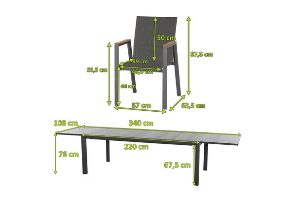 Wer das Besondere liebt ist mit diesem Ausziehtisch bestens bedient. Der Tisch bietet mit seinen Maßen von ca. 220/340x108x76 cm Platz für bis zu 10 Personen – so steht dem gemütlichen Mittagessen mit der Familie nichts mehr im Wege. Das Gestell wurde aus pulverbeschichtetem Aluminium in matt graphit hergestellt, was den Tisch besonders haltbar macht. Die Tischplatte besteht aus Glas/ Keramikpulver beschichtet in slate look. Die Unterschubhöhe beträgt ca. 65,5 cm – so kann man gemütlich mit vielen Arten von Sesseln an diesem Tisch Platz nehmen. Der Tisch hat ein Gewicht von ca. 73 kg, und ist somit perfekt gegen Windstöße geschützt.