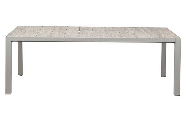 Wer das Besondere liebt ist mit diesem Esstisch bestens bedient. Der Tisch bietet mit seinen Maßen von ca. 220 x 100 x 74 cm Platz für 8-10 Personen – so steht dem gemütlichen Mittagessen mit der Familie nichts mehr im Wege. Das Gestell wurde aus pulverbeschichtetem Aluminium in matt silber hergestellt, was den Tisch besonders haltbar macht. Die Tischplatte besteht aus hochwertigem Keramik in Holzoptik in der Farbe washed grey, während die dreieckig geformten Tischbeine für ein weiteres optisches Highlight sorgen. Die Unterschubhöhe beträgt ca. 66,5 cm – so kann man gemütlich mit vielen Arten von Sesseln an diesem Tisch Platz nehmen. Der Tisch hat ein Gewicht von ca. 64 kg, und ist somit perfekt gegen Windstöße geschützt. Die Fußkappen bestehen aus schwarzem Kunststoff und schützen den Boden vor unschönen Kratzern beim Verrücken des Möbelstücks.