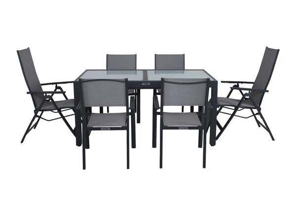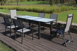 Diese Villana Esstischgruppe bietet Platz für sechs Personen. Die Verarbeitung von hochwertigen Materialien zu Möbeln mit edlem Design und praktischer Handhabung, bringt Ihnen Freude bei jeder Nutzung Ihrer neuen Gartenmöbel. Die Farb- und Materialkombination aus Anthrazit und Grau, Aluminium und Textilene schafft eine wandelbare Grundlage, welche die vielfältige Kombination mit anderen Möbelstücken oder Dekoration ermöglicht. Der Tisch hat ein Gewicht von ca. 32 kg, ist ca. 90 cm breit und ca. 75 cm hoch, wodurch er eine ideale Wohlfühlhöhe besitzt. Im eingeklappten Zustand besitzt er bereits eine Länge von ca. 160 cm, so dass Sie Ihrem Besuch reichlich Platz an Ihrem Tisch anbieten können.