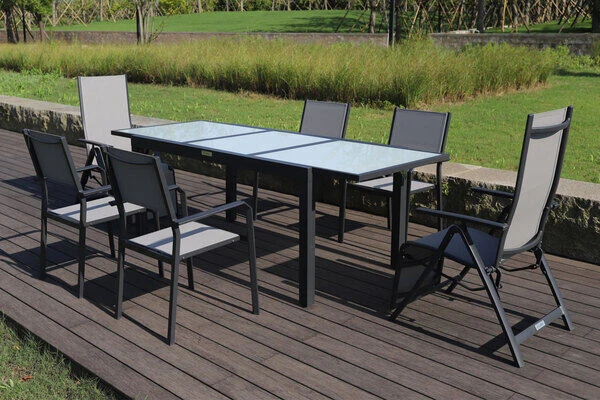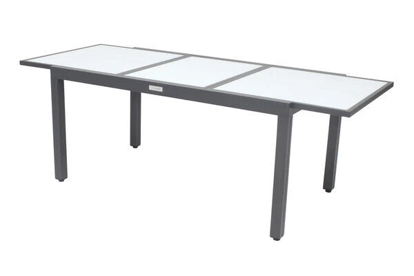Die Tischplatte besteht aus ca. 5 mm dickem Sicherheitsglas in einem weißen Farbton. Für spontanen Besuch oder größere Grillabende kann die Tischplatte auf eine Länge von ca. 220 cm ausgezogen werden. Dazu werden die beide oberen Tischplatten auseinandergezogen und die darunterliegende Platte nach oben geklappt. Nach dem Auszug hat der Tisch eine Länge von ca. 220 cm. Auch die Erweiterung der Tischplatte ist aus weißem Sicherheitsglas mit einer Dicke von ca. 5 mm. Das hochwertige Aluminiumgestell wurde sowohl bei dem Ausziehtisch als auch bei den Stühlen pulverbeschichtet und kommt in einem eleganten Anthrazit daher.