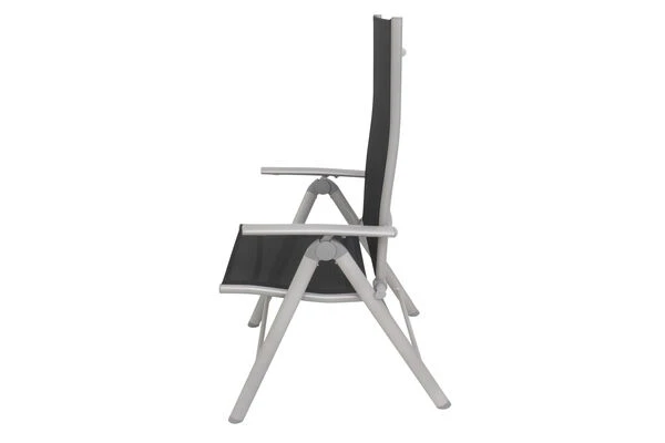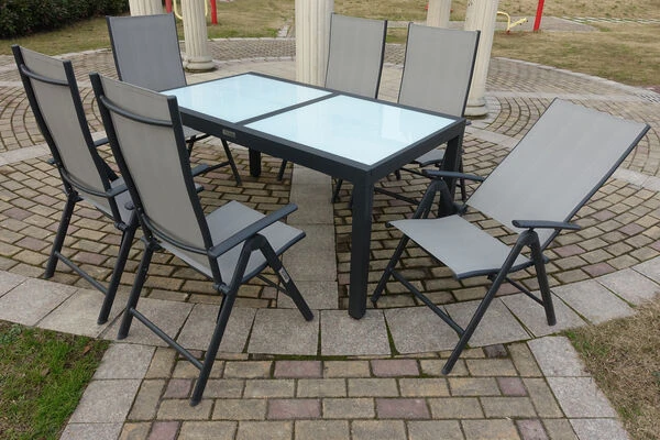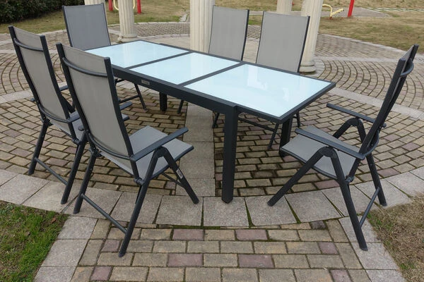 Diese Villana Esstischgruppe bietet Platz für sechs Personen – perfekt, um mit Freunden, Familie oder Nachbarn gemütlich im Garten oder auf der Terrasse zu sitzen. Die Gruppe setzt sich aus einem ausziehbaren Gartentisch und sechs Multipositionssesseln zusammen, auf Wunsch können Sie diese Gruppe auch noch mit passenden Artikeln der Villana Serie erweitern. Der Tisch ist ca. 90 cm breit und ca. 75 cm hoch, im normalen Zustand hat er eine Länge von ca. 160 cm, so sind Sie sowohl für ein gemütliches Mittagessen mit der Familie als auch für die große Gartenparty bestens ausgerüstet. Das pulverbeschichtete Aluminiumgestell des Tisches kommt in einem attraktiven Anthrazit daher, die ca. 5 mm dicke Tischplatte aus Sicherheitsglas ist weiß. Die Platte zum Erweitern des Tisches ist ebenfalls aus ca. 5 mm dickem Sicherheitsglas gefertigt und lässt sich durch einen Flügelmechanismus ausklappen. Man zieht einfach die beiden oberen Platten auseinander und klappt die darunterliegende Platte nach oben, und schon ist der Tisch auf ca. 220 cm erweitert. Der Sessel verfügt ebenfalls über ein anthrazitfarben pulverbeschichtetes Aluminiumgestell, auf welches ein formstabiles Textil-Gewebe 2×1 (70% Polyvinylchlorid / 30% Polyester) in Grau aufgespannt wurde. Mit Maßen von ca. 67 x 58 x 113 cm und einem Gewicht von nur ca. 4,3 kg lässt sich der Stuhl ganz leicht hin und her stellen. Gleichzeitig bietet er die nötige Stabilität und einen angenehmen Sitzkomfort, denn dieser Sessel ist wirklich ein Verwandlungskünstler. Er bietet seinem Nutzer neun verschiedene Einstellungen der Rückenlehne. So ist für jede Situation die richtige Liege- oder Sitzeinstellung dabei – ob beim Essen mit Freunden oder Familie, beim Lesen eines Buches oder beim Sonnenbaden. Bei Nichtgebrauch lassen sich die Stühle ganz leicht zusammenklappen und nehmen so sehr wenig Platz ein. Mit einer Belastbarkeit von bis zu ca. 160 kg ist der praktische Sessel besonders robust und für erholsame Stunden in der Sonne einsatzbereit. Die Fußkappen der Möbel sind aus schwarzem Kunststoff und schützen den Boden vor unschönen Kratzern beim Verrücken des Stuhles, die silbernen Schrauben aus galvanisiertem Stahl runden die Optik perfekt ab.